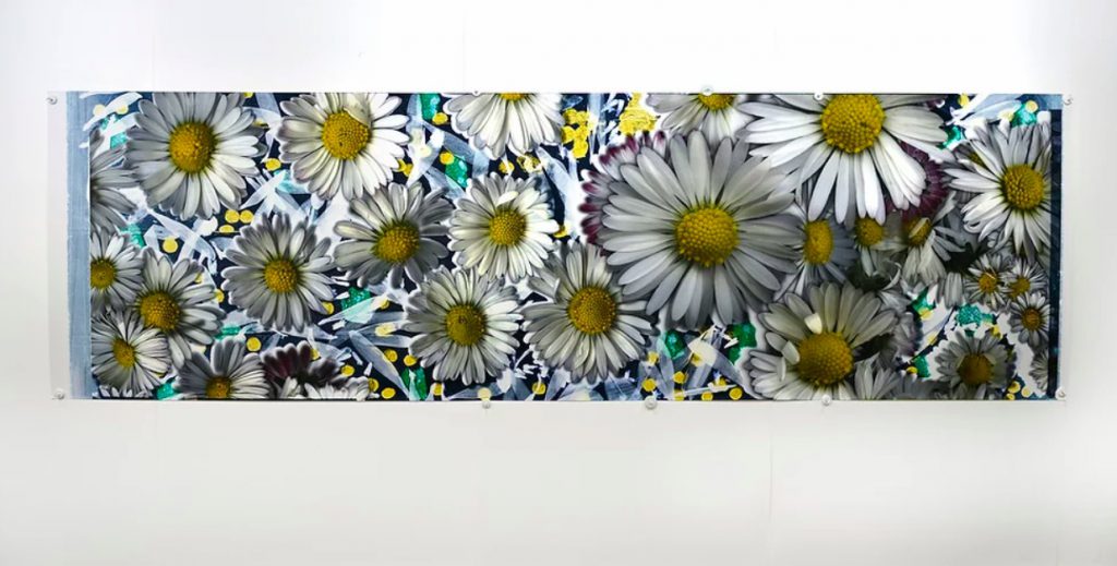 Ses Sténopés, suivant le principe de la camera obscura, sont une variante plus irréelle, impalpable, d’images où les objets semblent exempts de contours, plongés dans leur bain de couleurs d’où surgissent des visages évanescents (là encore, des images dans l’image) : « Il n’y a pas de grain, pas de matière… Le sténopé ce sont des couleurs pures, qui se mélangent. » Les techniques employées, cependant, ne sont pas le sujet et Baptiste Rabichon déplie les subtilités de son médium dans une approche avant tout sensible, et volontiers sensuelle, qui est loin de lui ôter son mystère, au contraire. Depuis peu, à l’aide d’un système de caches, il produit ainsi de grands formats associant images numériques et argentiques, comme ces ensembles fleuris au sein desquels apparaît parfois la silhouette de l’artiste (Ranelagh, 2016) ; une hétérogénéité visuelle préhensible bien qu’à peine identifiable. Les photographies de Baptiste Rabichon nous emmènent là où ce dernier trouve matière à sa fascination, dans le sens d’une sophistication du regard : à la limite – ou dans les marges – du visible. Texte par Marine Relinger.