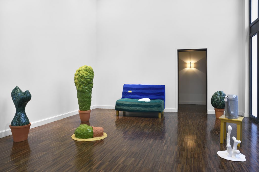 Somewhere Where The Grass Is Greener (2015) nous conduit donc dans les salons de notre enfance : un petit « chien-chien à sa mémère » dort sur un tapis de laine, posé sur un canapé recouvert d’un patchwork aux couleurs un peu ringardes, mais moelleuses de tendresse. Toutes les sculptures de l’artiste recèlent souvent une petite surprise, et dans cette installation, ce sont les allusions sexuelles qui surgissent en toute liberté sur une plante, un arrosoir ou des animaux domestiques (Pet Penis et Pet Pussy). Dans un univers kitsch et policé, en apparence inoffensif, la tempête est vite arrivée : les Pet Poo, crottes de céramique, nous confirment qu’on a bien basculé dans l’horreur de l’accident domestique.