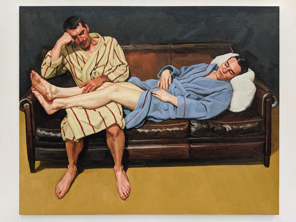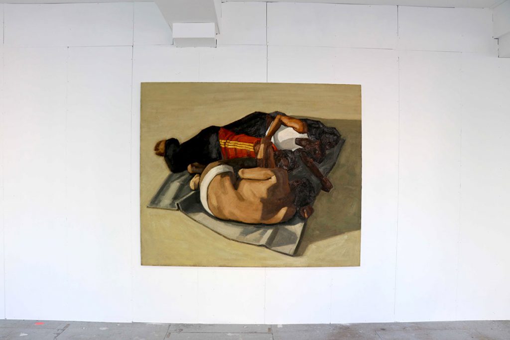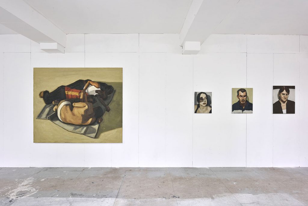 Lauréat du prix des Amis des Beaux-Arts et de la bourse Diamond en 2016, tout juste diplômé des Beaux‑Arts de Paris, Maxime Biou a essentiellement peint ses proches, saisis dans l’attente, le relâchement, le sommeil parfois.Cette possible mélancolie compose, par ailleurs, une généalogie de corps lourds, exemptés des postures mondaines habituelles : c’est le bénéfice de l’abandon, d’où se dégage une certaine fragilité. Que le modèle soit peint d’après nature ou d’après un cliché réalisé par l’artiste, le temps de pose est excessivement long : le temps qu’il faut pour capturer cette présence‑absence et représenter le temps en peinture ; le temps qu’il faut pour saisir un corps dans sa matérialité, confrontée à la touche matiériste qu’a élue le jeune peintre, inspiré par Francis Bacon ou Lucian Freud.