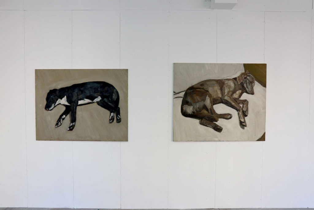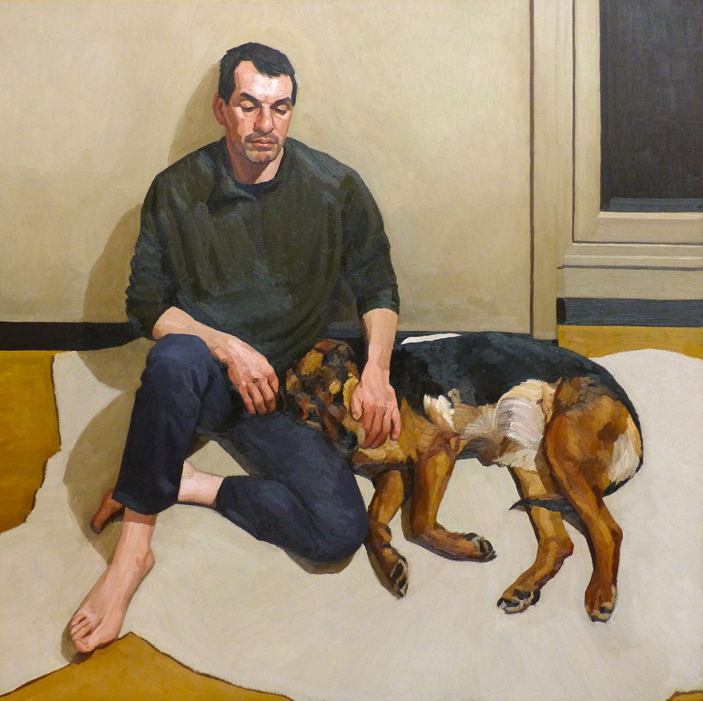 « La matière et sa composition m’intéressent en premier lieu. Le sujet et l’effet qu’il produit, chez moi ou chez les autres, est une question plus récente », rapporte-t-il. La photographie en outre n’est qu’un support, un certain nombre d’éléments étant peints de tête ou simplifiés, au profit d’un imaginaire à même de renverser les espaces de la maison familiale dont est issu l’ensemble de sa production. L’une de ses dernières toiles — qu’il ne titre jamais — représente son père assis contre un mur, son chien lové contre lui. Un certain réalisme entre en friction avec l’épure, un grand tapis blanc en aplat venant perturber l’espace.